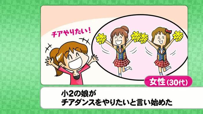 「小2の娘がチアダンスをやりたがっているのだが、教室が遠方で送迎が必要。自分がどこまでサポートできるか不安」という30代女性のエピソードも登場した。