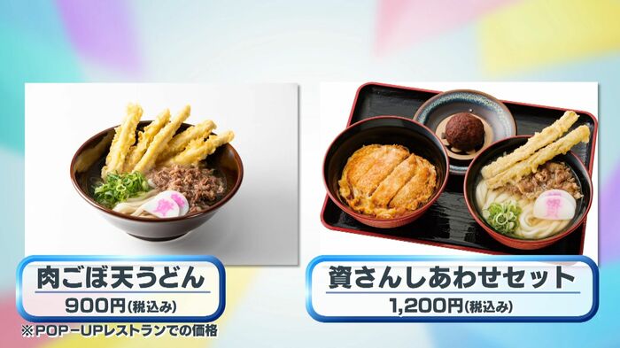 メニューは「肉ごぼ天うどん」単品と、肉ごぼ天うどん、カツとじ丼、ぼた餅がすべてミニサイズでセットになった「資さんしあわせセット」の2種類。