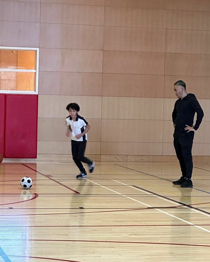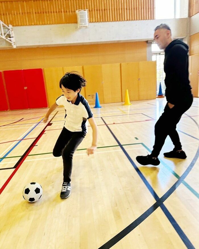 翌日の投稿では「今日はサッカー 蹴り方の練習から」とコメントし、体育館のような場所で、長男・新之助さんにサッカーを教えている様子を公開した團十郎さん。