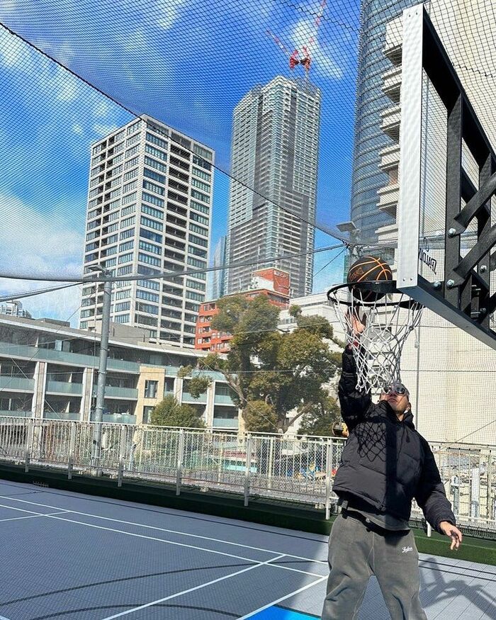 團十郎さんがゴールにシュートを決めた瞬間のショットでは、手がゴールリングに届いていて、高いジャンプ力を発揮していることがうかがえます。