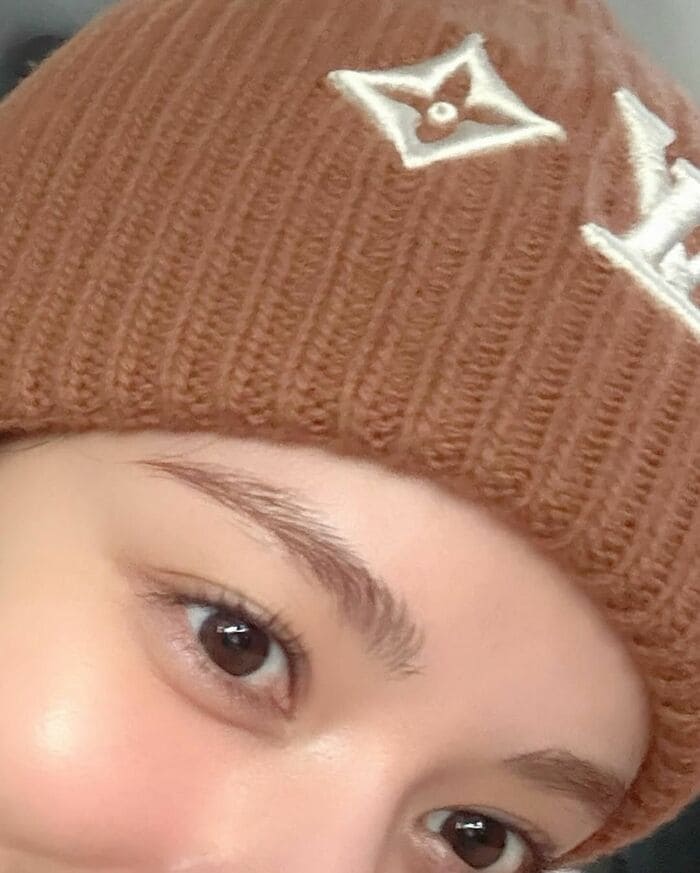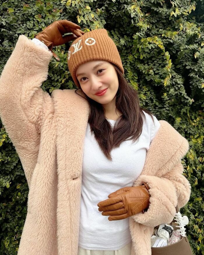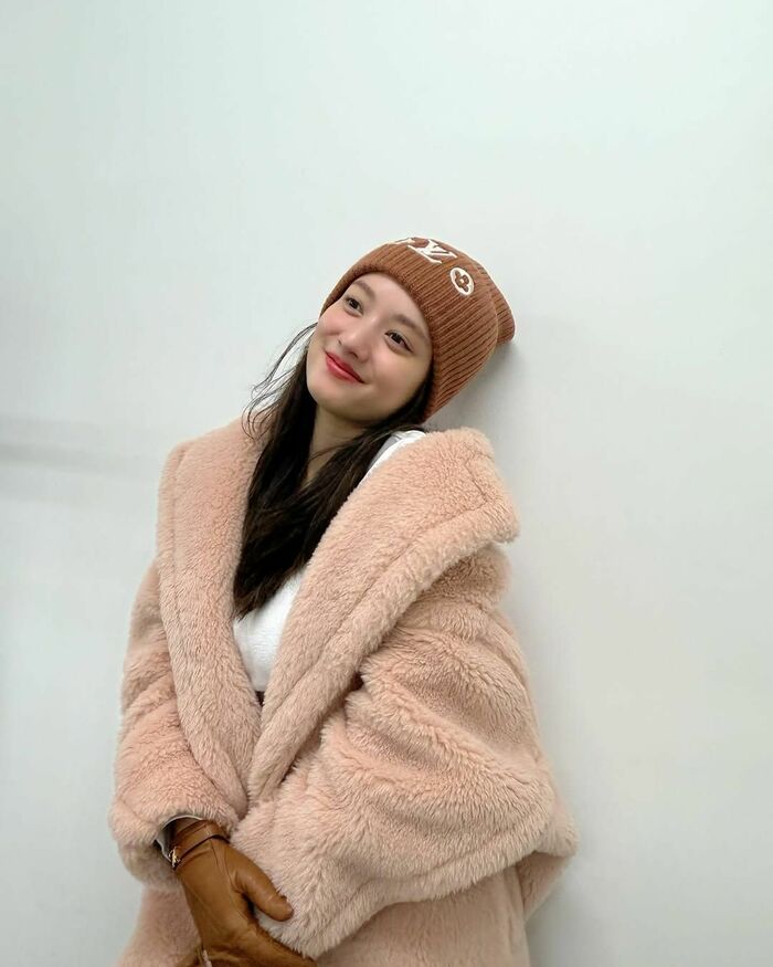 谷さんはピンクとブラウンのハートの絵文字とともに、薄いブラウンのニット帽と淡いピンクのファーコート姿のコーディネートを披露。