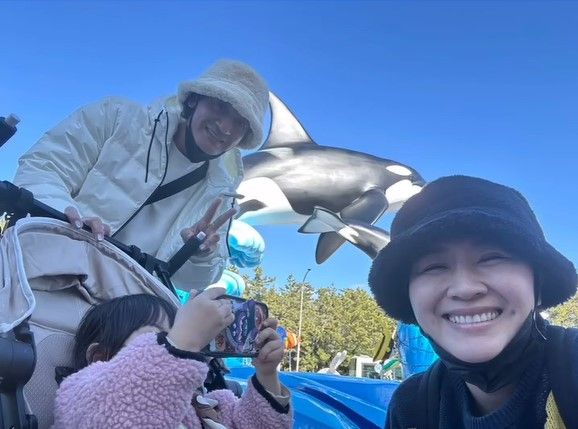 晴れ渡る青空の下、シャチのオブジェをバックに撮った家族ショットでは、白い帽子に白いアウター姿の本並さんが愛娘“ぷくぷく”ちゃんの乗っているベビーカーを押しながらカメラに向かってピースサイン。黒い帽子姿の丸山さんも弾けるような笑顔で、見ているだけで幸せになる1枚です!