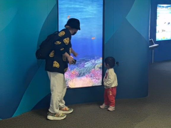 大きな水槽に駆け寄る“ぷくぷく”ちゃんとそれを追う本並さんの後ろ姿を投稿。