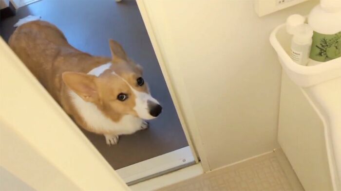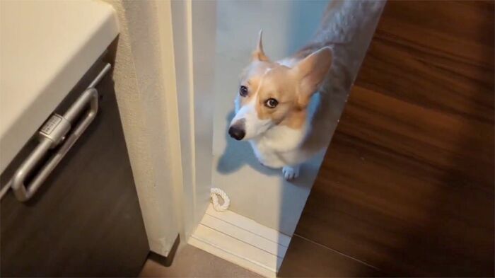 お風呂場から出ようとしたママがスーっと扉を開けると、そこには上目遣いで待っている、こまちちゃんの姿が!