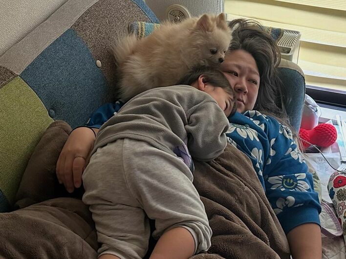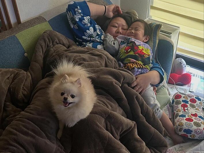 そこには、ソファに仰向けで寝転がるやしろさんと、その隣でぎゅーっと目を閉じて一緒に寝ている「やさ丸」くん。そして、毛布をかけたやしろさんのお腹の上には「こはな」ちゃんの姿が。