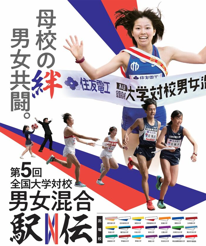 大阪・長居公園の特設コースを、男女6人が交互にタスキをつなぎます。5度目の開催となる今回は、全国から20校が出場。関西学連選抜を加えた計21チームが火花を散らします。