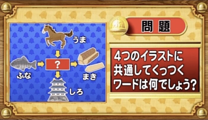 「ふな[?]」「うま[?]」「[?]まき」「[?]しろ」。4つのイラストに共通してくっつくワードは何でしょうか?