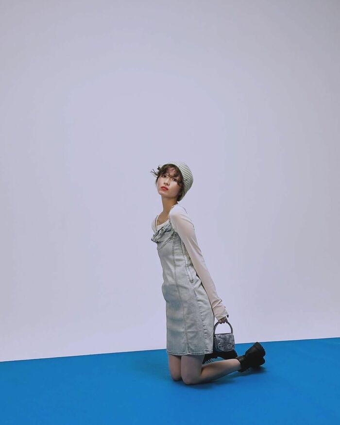 ニット帽にデニム生地のミニワンピコーデでの膝立ちショットではうつろな目でカメラを見つめる岡崎さんの姿が!