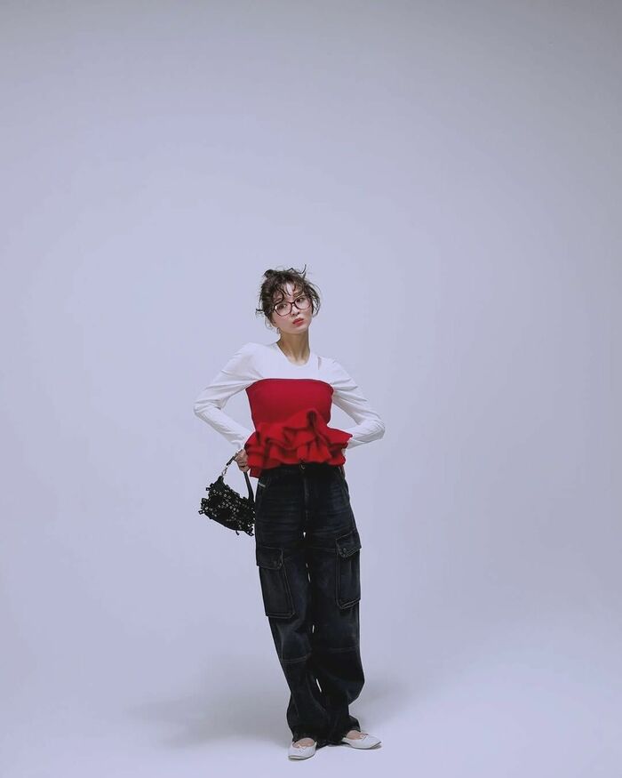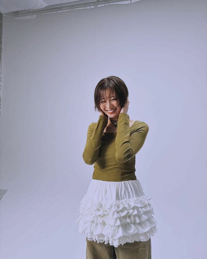 腰回りのフリルのデザインがかわいい服を着て、くるくるとカールした髪の毛を披露する岡崎さん。メガネをかけてオシャレ雰囲気を漂わせています。