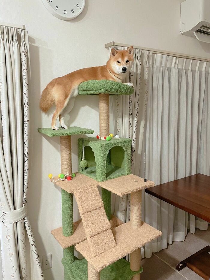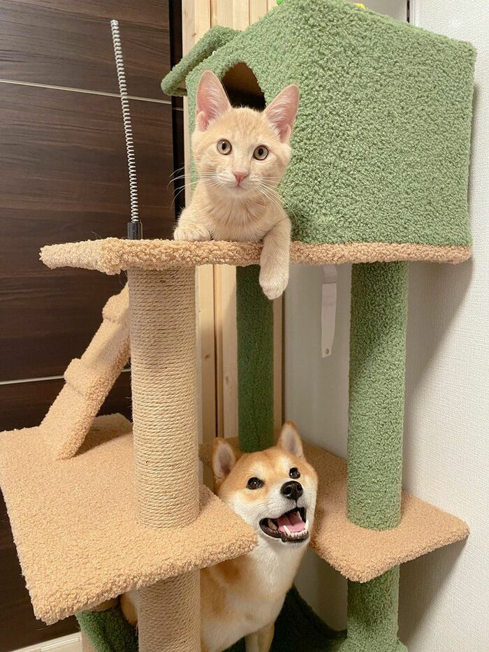 今回も、いつものようにきんぴらくんを追いかけていましたが、キャットタワーの頂上まで登っているのは今回が初めてだったということで、飼い主さんも驚いたんだそう。