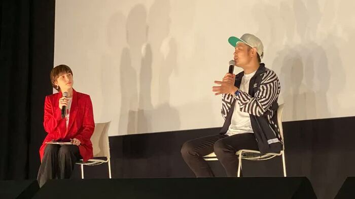 上映終了後、地下アイドルの主人公・未央がライブシーンで着ていた衣装で登場したEMILYは“悪役を演じる男たち”が主役の今回は進行役にまわり、ゲストである品田誠、岩崎う大、品川ヒロシ監督を呼び込んだ。