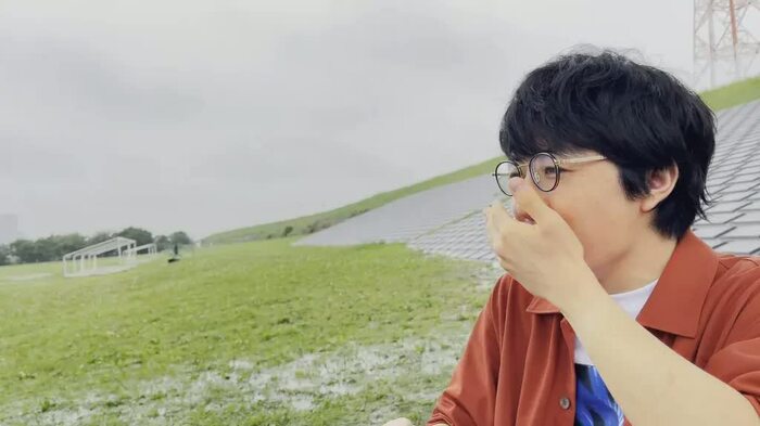 のどかな河川敷を舞台に、「♪すぐおいしい、すごくおいしい」と美声を聞かせる崎山の様子は必見!