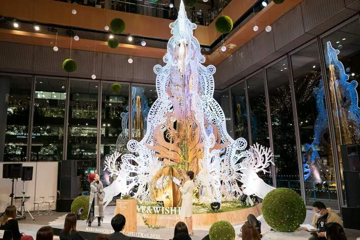 会場である丸ビル1階マルキューブに設置されたのは、高さ約10m「愛と希望」をテーマにしたクリスマスツリー。