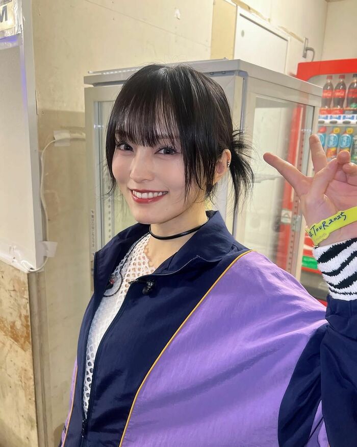 舞台裏でのオフショットでは、紫を基調としたライブ衣装をまとってカチモリヘアの山本さんがカメラに向かって笑顔でピースする姿を披露。可愛らしさとカッコ良さが共存する山本さんの笑顔に思わずキュンとしてしまいます。