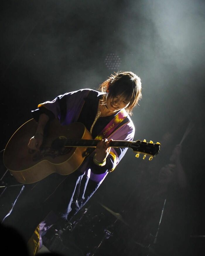 さらに、別のカットでは暗闇の中でアコースティックギターを弾く山本さんの姿が写し出されています。山本さんを照らすスポットライトが幻想的な空間を作り出し、ライブをより特別なものにしています。