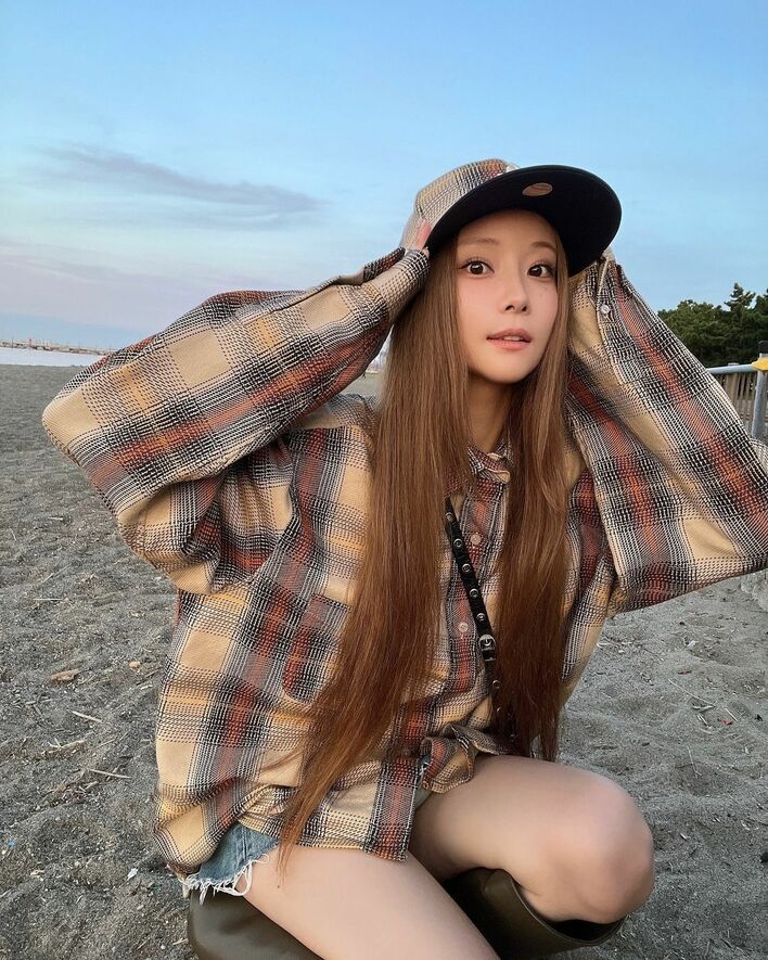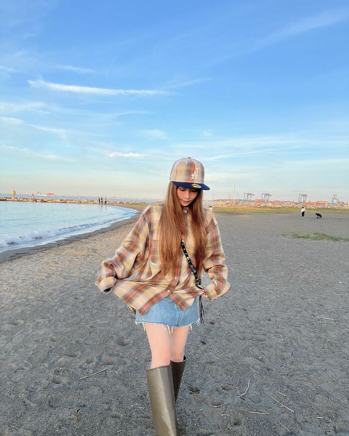 砂浜でのオフショットを公開し、デニムの超ミニスカートにチェック柄のシャツとキャップ、ロングブーツを合わせたコーディネートで美脚を披露しました。