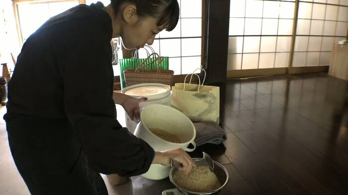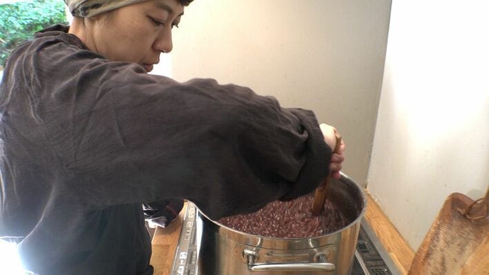 通常あんこ作りでは小豆を一晩水に浸すが、彼女はそれをせずにいきなり炊き始めるという。雑味の原因となるアクを抑えるため、一度煮汁を捨て、再び火にかけると、アクを丁寧に取り除く。