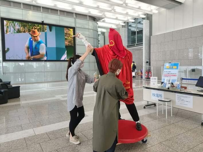 5階のフジテレビギャラリーでは、現在開催中の「ガチャピン・ムックミュージアム」にも登場し、各種展示物や歴代の出演者の衣装も“見学”していた。