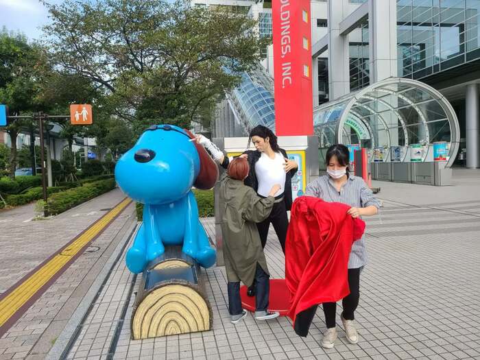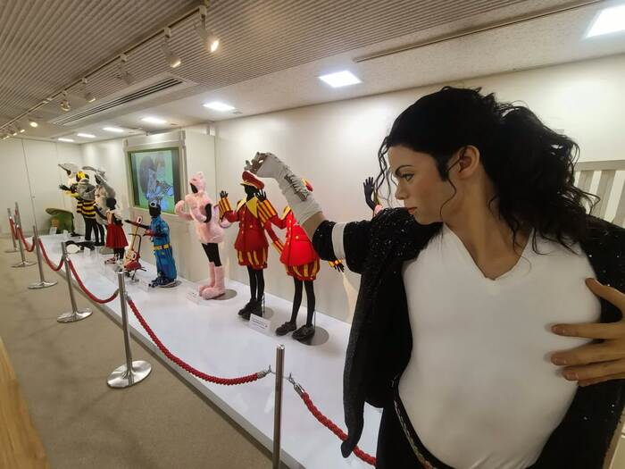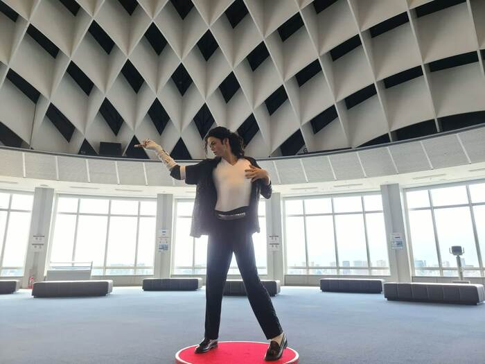 このポーズでおわかりだろう。そう…!世界的ポップスター、故・マイケル・ジャクソンさんの等身大フィギュアだ。ご近所のマダム・タッソー東京から“歩いて”やってきたのだ。