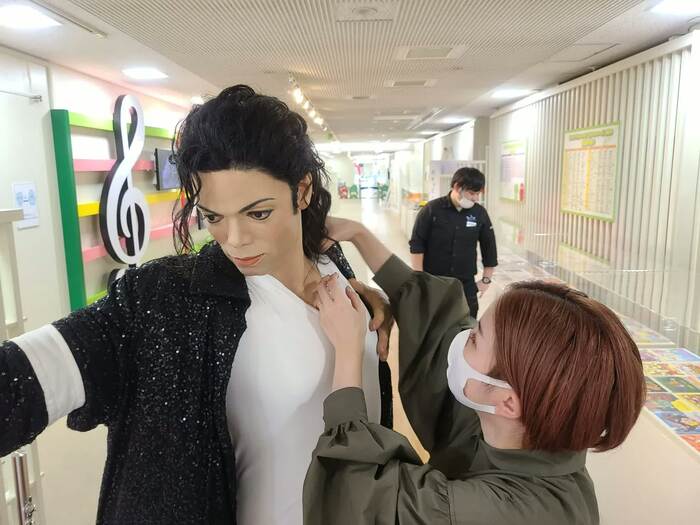 マイケルさんを連れてきた、マダム・タッソー東京の土井奈津子さんと栗田夏実さんは、おふたりとも特殊メイクの学校を経てフィギュア・メンテナンス・チームの一員になったという。マダム・タッソーでは、来場者が自由にフィギュアに触れられるため、メンテナンスをなんと毎日行っているそうだ。「オープン前に、ダメージが大きいところをチェックし、油絵の具で“メイク直し”をします。大幅な塗り替えは、1週間かけることも」(土井さん)。またフィギュアは人毛を使っており、ヘアワックスやヘアスプレーでセットされており、どうしてもほこりやお客さんの手あかがついてしまうため、しっかりシャンプーをしているというから驚きだ!