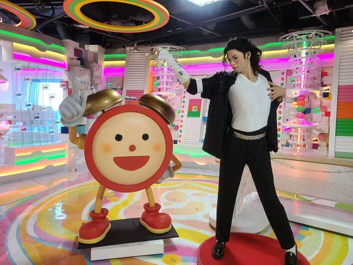 今にも「フォー!」というかけ声と共に、伝説の歌声が聞こえてきそうなマイケルさんのフィギュアは、フジテレビに何をしにきたのだろうか?こちらは、『めざましテレビ』で使用していたスタジオでめざましくんとパチリ。