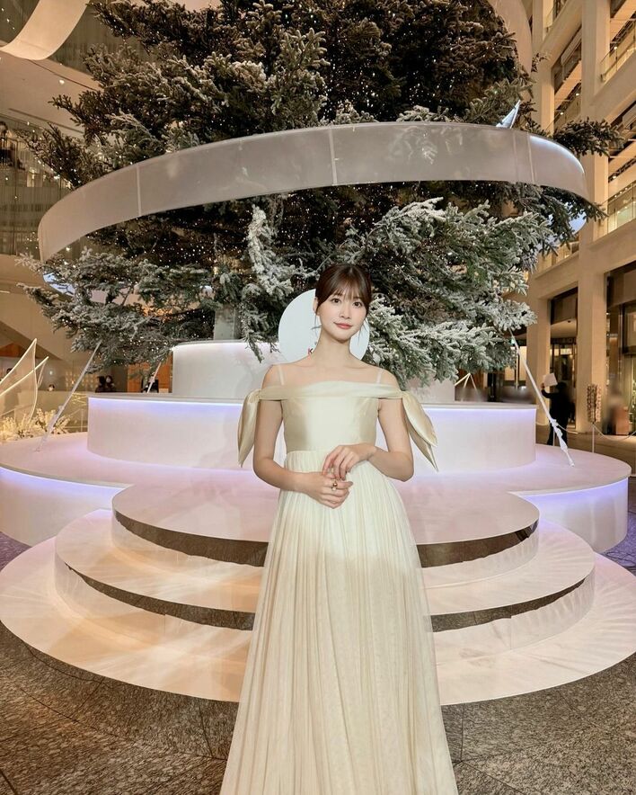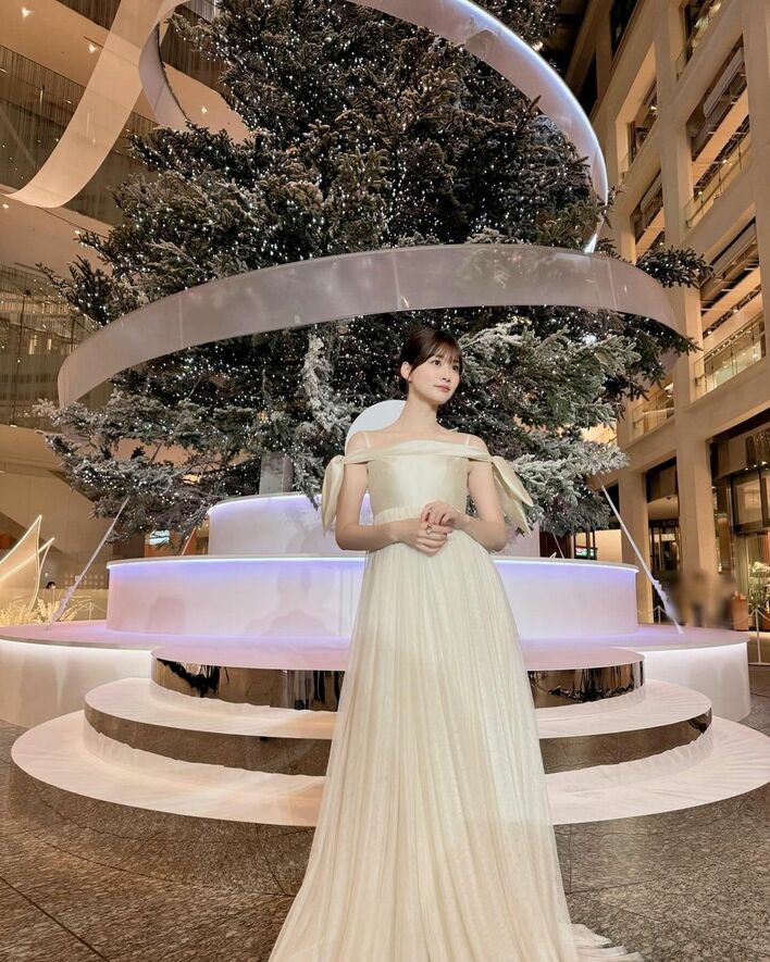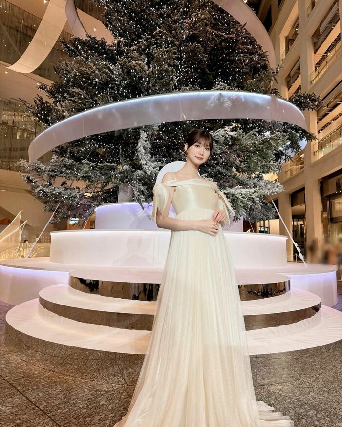 公開された写真を見ると、点灯した大きなツリーの前で、純白のドレスに身を包んでいます。オフショルスタイルで、両肩辺りには大きなリボンが付けられています。