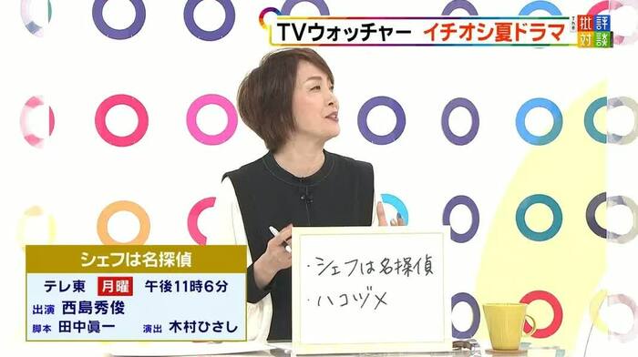 梅田氏がおすすめしたのは、フレンチレストランのシェフである西島秀俊が、人並み外れた洞察力と推理力で、訪れた客たちが巻き込まれた事件や不可解な出来事の謎を解くグルメミステリー『シェフは名探偵』(テレビ東京)。※8月2日で放送は終了。