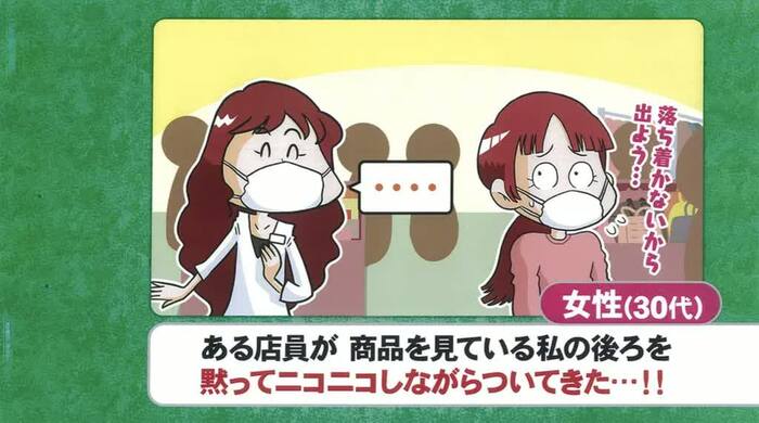 「新しい接客のカタチ」では、新型コロナウイルスの感染予防対策で店員から話しかけられるのが減ったかわりに、「店員に無言でずっと後ろをついて回られて、プレッシャーを感じた」という30代女性の体験談が登場した。