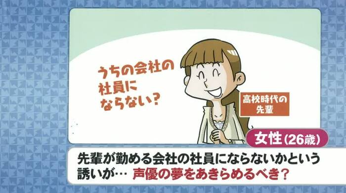 ほか、「声優を目指していたが、就職の話が。夢を諦めるべき?」という26歳女性の悩みに対しては、竹山は「自分が納得してから決めるべき」とアドバイスし、リンゴも「30歳まで頑張る、月に何本仕事が入らなければ辞める、などの条件を考えてみては?」と言い添えた。