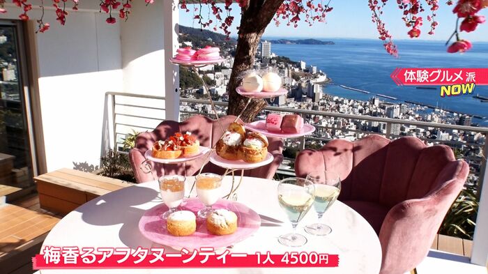 さらに、屋外のテラスには梅の花をイメージした貸切の特別席があり、眼下に広がる熱海の海を眺めながら、「梅香るアフタヌーンティー(1人4500円)」が味わえます。