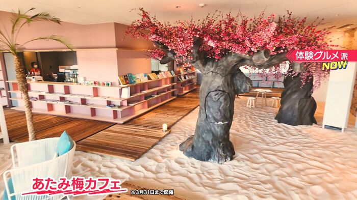 本物の白い砂が敷き詰められたカフェエリアでは、今の時期限定で“あたみ梅カフェ”を開催中。