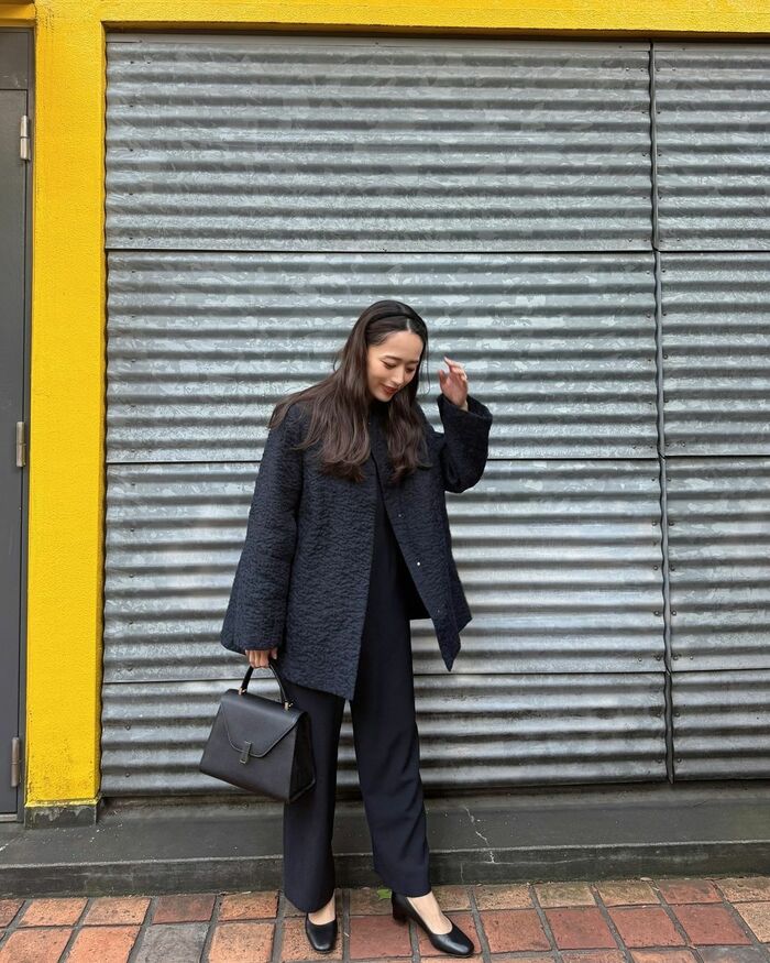 足元はローヒールの黒いパンプス、手元には黒いハンドバッグを持ち、全体的に落ち着いたモノトーンカラーでコーディネートされていて、髪形はナチュラルに下ろしたロングヘア、前髪はヘアバンドで上げられ、すっきりとした印象が感じられます。