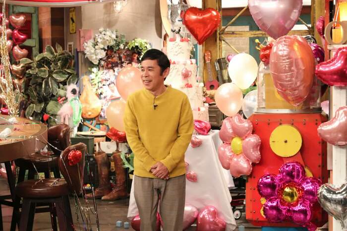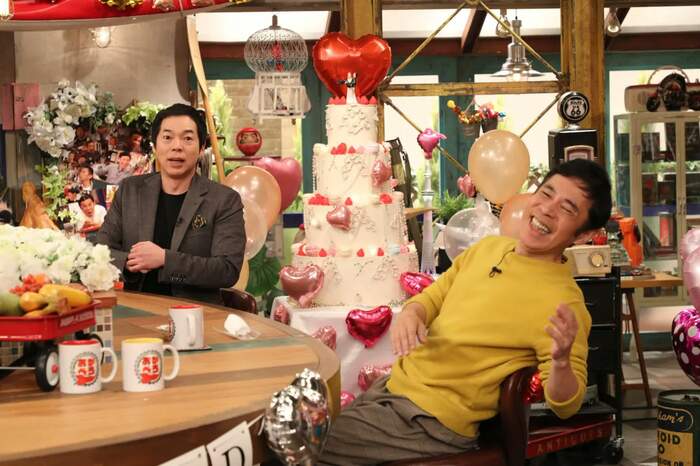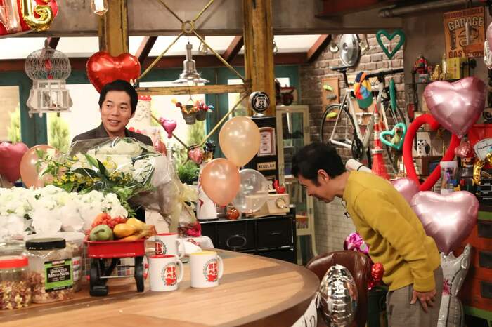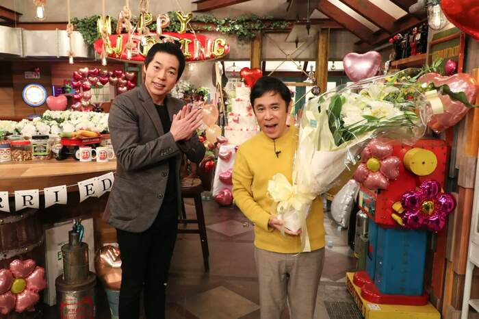 岡村がのろけトークを連発していると、大きな花束を持った今田耕司がサプライズで登場。