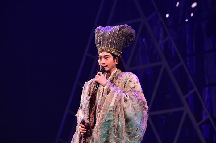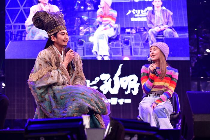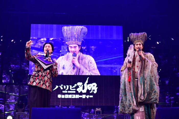 会場に集まったファンの熱気が高まるなか、“諸葛巾”と呼ばれる頭巾と鮮やかな着物の唯一無二の劇中衣装を身にまとった諸葛孔明役の向井さんが登場。「皆様、こんばんは。私、姓は諸葛、名は亮、字を孔明と申します」とお馴染みの挨拶で会場を一気に盛り上げます。