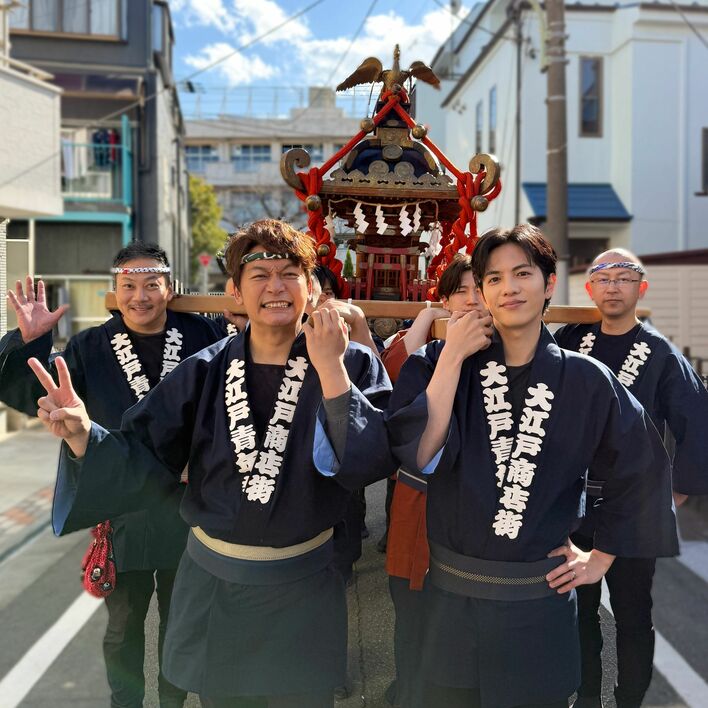 このショットに、SNSには「405(シンゴ)万円のお神輿を担ぐ一平さんと正助くんのWイケメンのはっぴ姿カッコいい」「ふたりの表情もポーズもバラバラなのがいい感じです!」「はっぴ姿似合ってますし、カッコイイですね♡」「ええ写真☆」の声が。