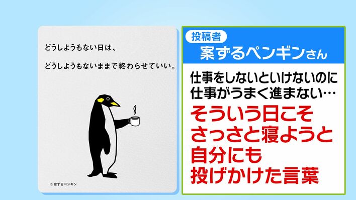 川村さんは、SNSで人気の「案ずるペンギン」さんの「どうしようもない日は、どうしようもないままで終わらせていい」という言葉から、力をもらったと紹介しました。