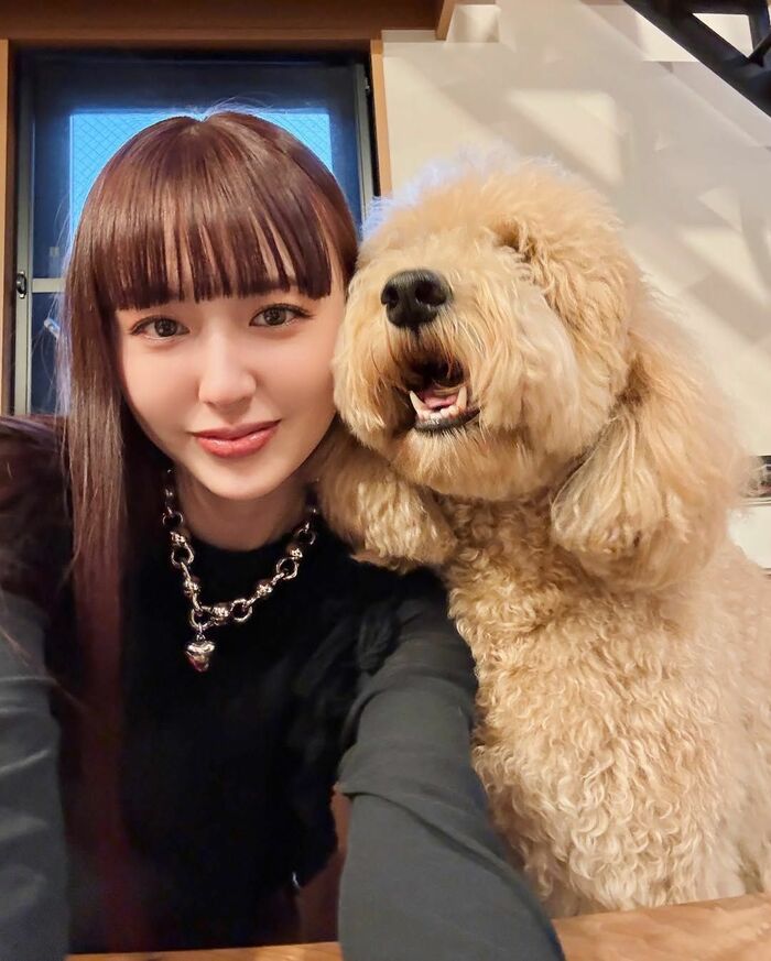 そして、ベージュの毛色をした垂れ耳のワンちゃんに、鈴木さんが頬を寄せたショットも披露。