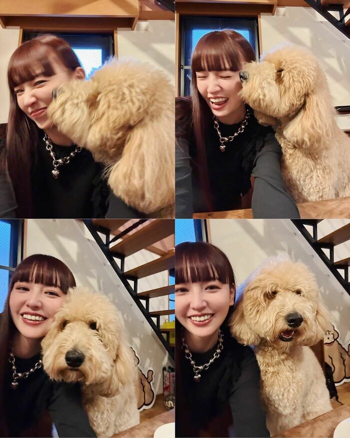 さらに、ワンちゃんとのコラージュ写真では、鈴木さんの頬にクンクンと鼻を寄せるワンちゃんにくすぐったさそうに笑みをこぼした鈴木さんの姿や、顔を前に出してカメラを見つめるワンちゃんに笑顔の鈴木さんが寄り添う様子などが写し出されています。