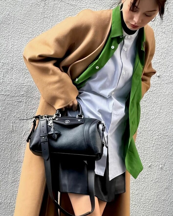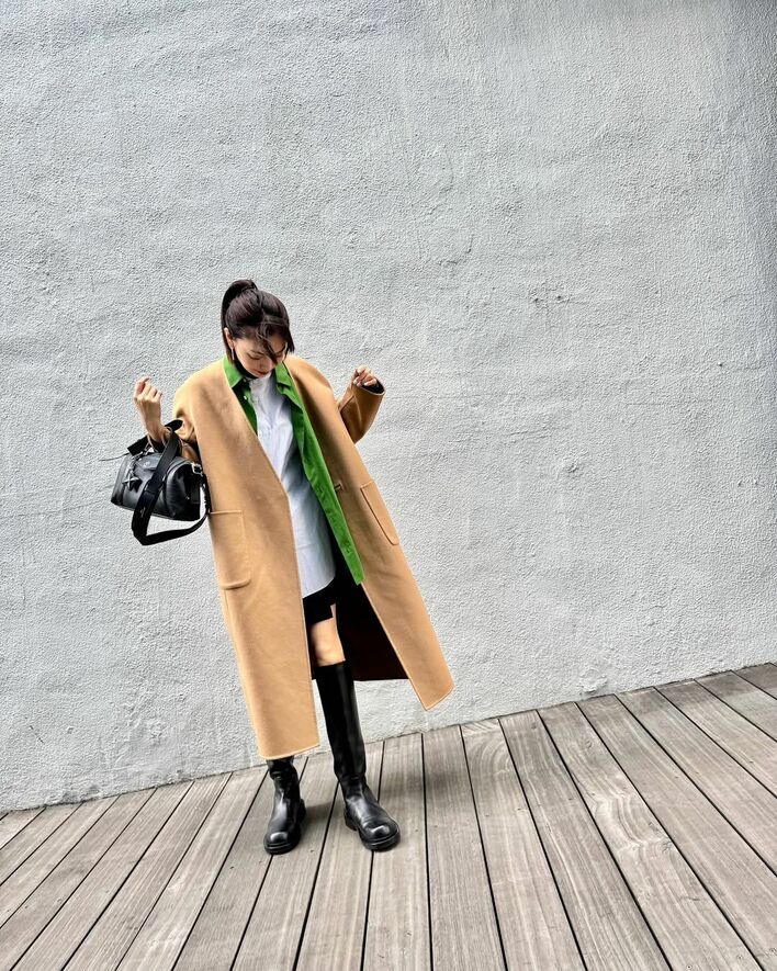 写真には、ブラウンのコートに、緑色のシャツ、そしてミニ丈のスカートに黒のロングブーツに黒のバッグを身に付けた蛯原さんの姿が。