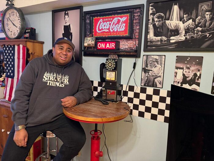 さらに、黒電話のようなものが置かれた、ラウンドテーブルに寄りかかったショットも公開。壁には、ここでもコカ・コーラの看板やオードリー・ヘプバーンさんなどハリウッドスターのポスターが飾られています。部屋の隅々までこだわり抜かれた空間に、思わず心が躍ってしまいます。
