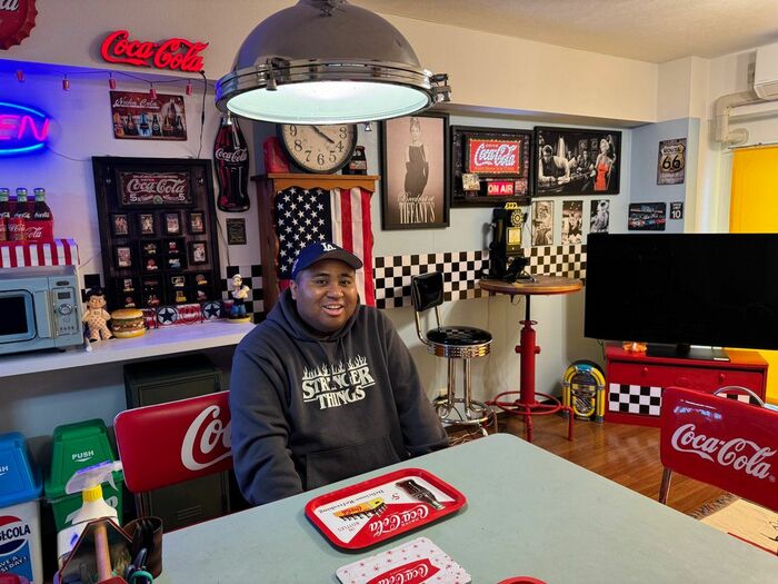 公開された写真を見ると、アメリカの国旗や赤いコカ・コーラの照明に椅子など、まるでアメリカのダイナーのような空間が広がっています!テーブルの下には、白と黒のギンガムチェック柄のカーペットに、奥には黄色のカーテンなど、ポップな雰囲気に仕上がっています。