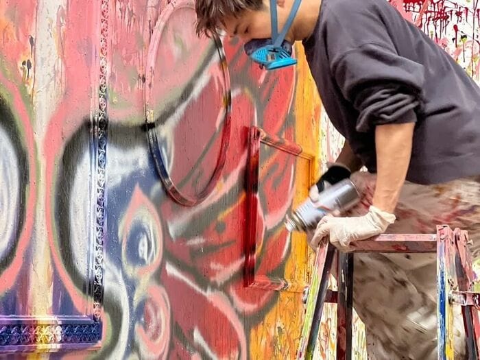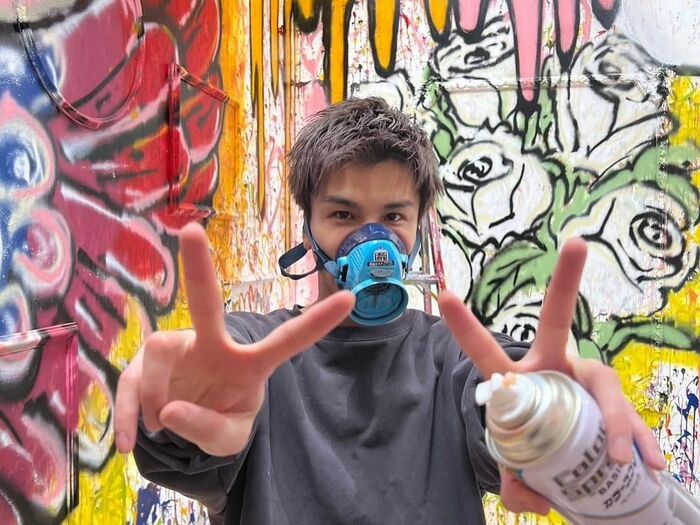そして、この日もブースに足を運んだ岩田さん。その手にはウォールアートなどでお馴染みのカラースプレーが!