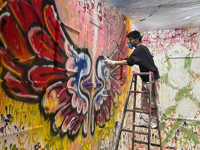 元々は色とりどりのペンキでカラフルに色づけられていた壁に、赤や青のクールな色彩が印象的な羽根と白いバラの花束が出現!