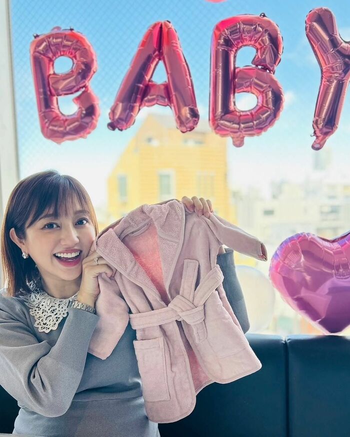 さらに、菊地さんは、窓に飾られた「BABY」という文字のバルーンを背景に、プレゼントでもらったものとみられる赤ちゃん用のピンクのバスローブを持っているショットも公開!