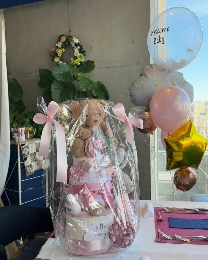 公開された写真には、ピンクやグレーのバルーンに囲まれ、手にはピンクのリボンとくまのぬいぐるみが飾られたおむつケーキを持っている菊地さんの姿が!