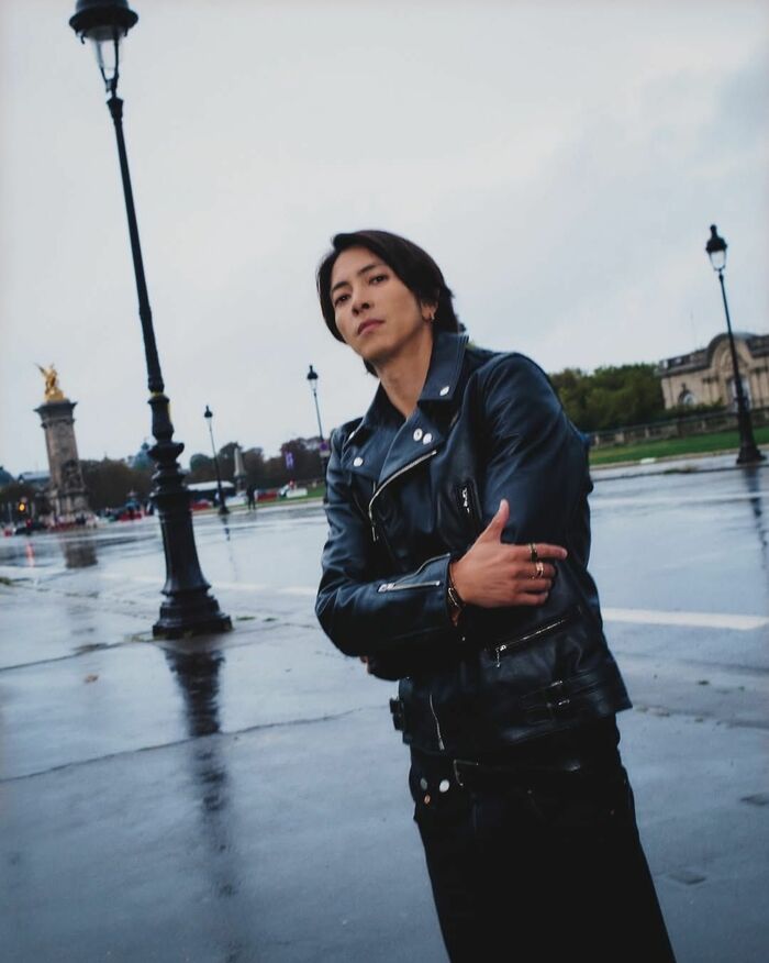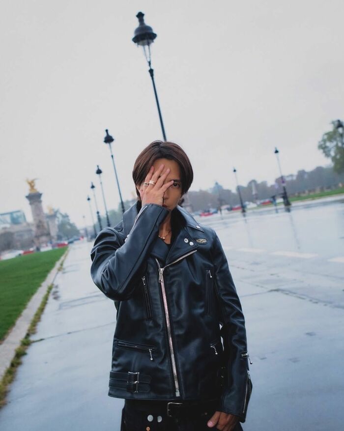 右手で顔半分を隠し、左手はポケットの中へ入れ、クールにポーズを決める山下さん。スタイリッシュな黒のライダースジャケットを羽織った姿がパリの美しい風景に溶け込み、まるで絵画のような1枚です。