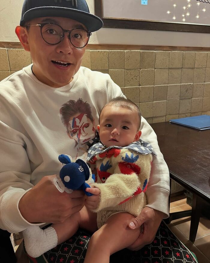 そして、おしゃれなレストランで、白のスウェット姿の井戸田さんが、もこもこのニットを着ている“ベビバーグ”を抱いているショットも公開。
