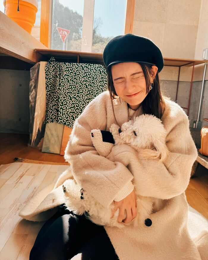 また、お店にはふわふわな毛並みがかわいらしい看板犬がいたそうで「大福がお出迎えしてくれて めっちゃ可愛いカメラ目線もらった♡たまらんたまらんたまらん」とつづり、いとおしそうに抱っこするショットも。看板犬はバッチリカメラ目線をしてくれたり…