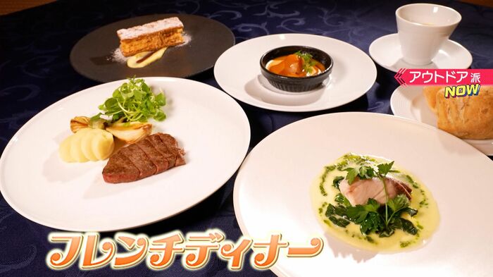 いろいろなアウトドア体験以外にもフレンチディナーやサラダバー付き朝食がプランに含まれています。
