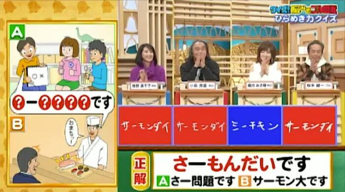 正解は「さーもんだいです(さー問題です/サーモン大です)」。牧野、小島、桜木の3人が見事正解!
